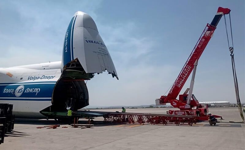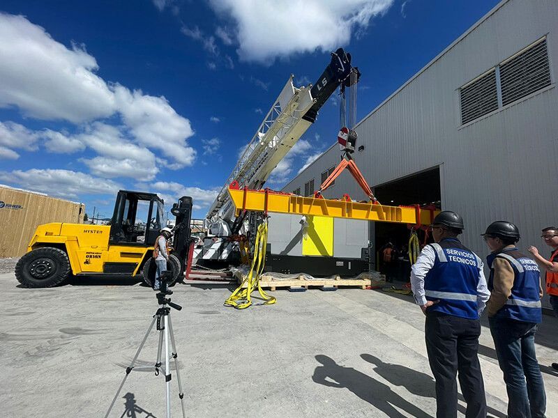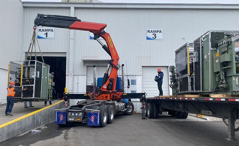 Personal profesional en maniobras, carga y descarga de maquinaria pesada.
